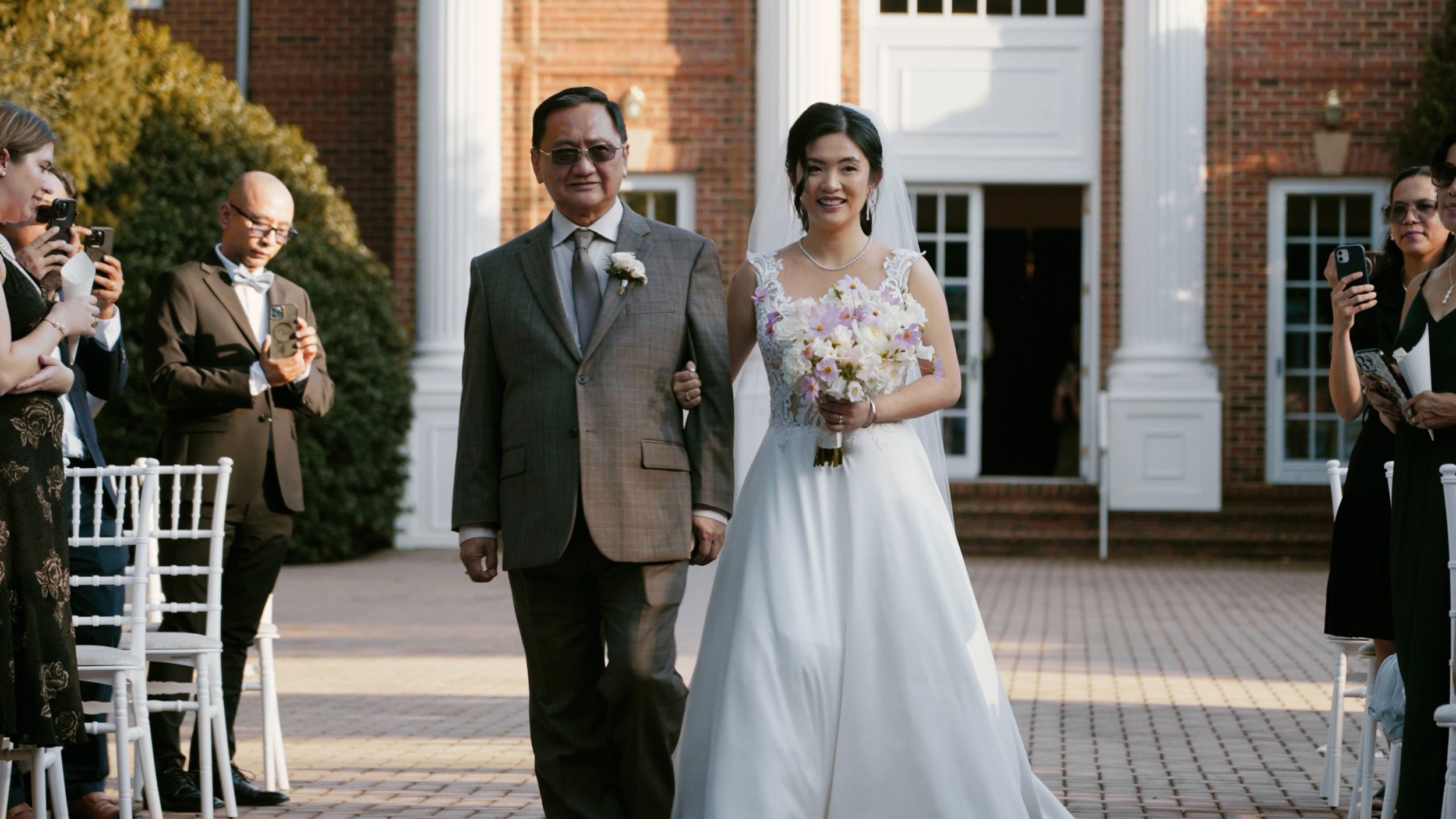 By 3 p.m., we stepped out to the manicured paths, where Htoo waited in a quiet corner of the grounds. His turn to see her—hands clasped, that shared glance saying volumes without a word. Then came her dad's turn, a hug that lingered, before we wrangled the bridal party for shots amid the estate's tree-lined drives. Time blurred from there: Bridal party portraits blending into arriving guests, the patio transforming as chairs filled rows under the afternoon sun.